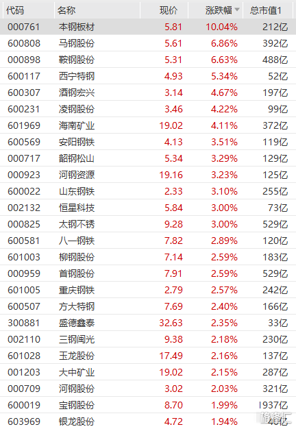 钢铁板块走高,本钢板材涨停,马钢股份、鞍钢股份涨超6%,西宁特钢、酒钢宏兴、凌钢股份等跟涨。本钢板材昨日披露2021年半年度报告显示,公司2021年半年度实现营业收入为385.88亿元,同比增长73.94%;归母净利润22.09亿元,同比增长767.41%;基本每股收益0.57元。