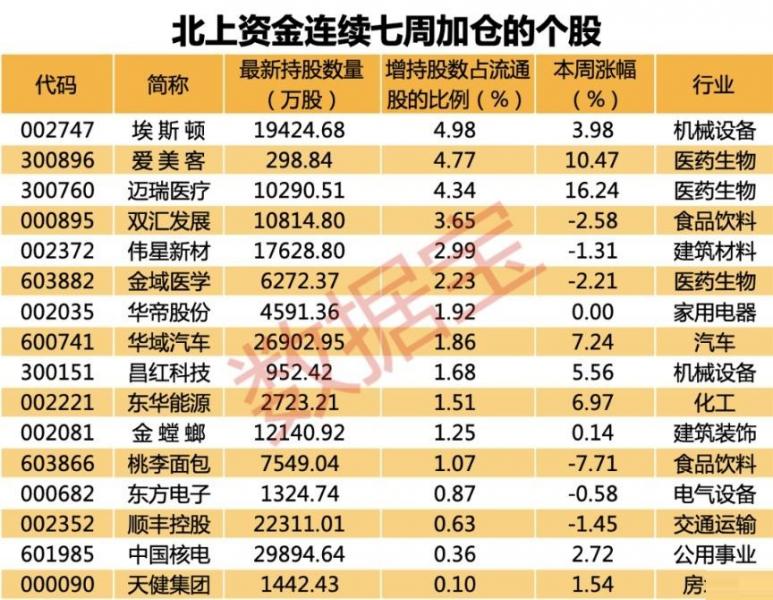最新数据显示,北上资金共持有2258只个股,合计持股量983.04亿股,相比上周末,持股总量增加10.52亿股,环比增幅为1.08%。近期硅片价格再度呈现密集上涨的趋势,光伏概念股因此成为北上资金最爱,龙头股隆基股份也成为本周最热的股票,股价上涨,市值超过4900亿元。北上资金连续7周买入16股,从持股比例变动情况来看,埃斯顿获加仓幅度最大,较7周前增持股数占流通股的比例为4.98%;其他连续加仓的还有爱美客、迈瑞医疗、双汇发展、伟星新材、金域医学等,加仓力度均超过2%。