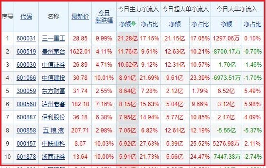 今日沪深两市主力资金净流入排名前5的个股分别为:三一重工、贵州茅台、中信证券、中信建投、东方财富;主力资金净流出排名前5的个股分别为:天齐锂业、赣锋锂业、北方稀土、五矿稀土、包钢股份。