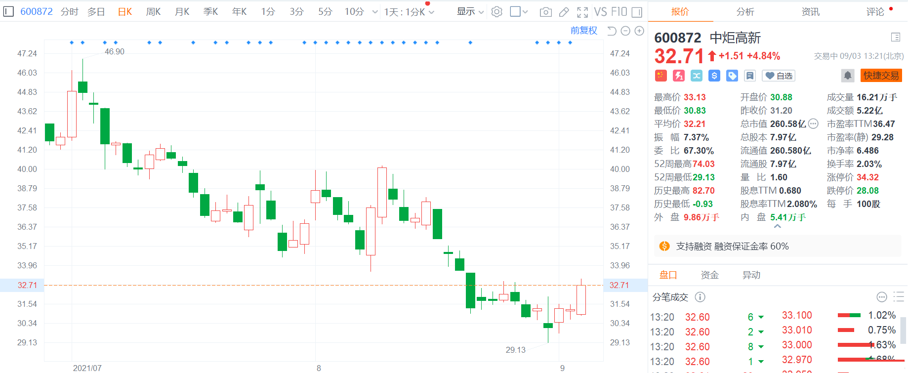 中炬高新(600872.SH)涨近5%,报32.71元,总市值261亿元。