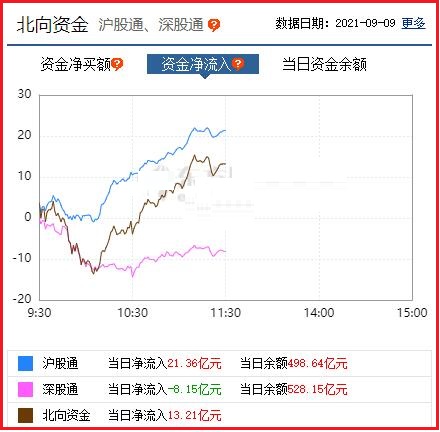 截至午间收盘: 北向资金净流入13.21亿元,其中沪股通资金净流入21.36亿元,深股通资金净流出8.15亿元。