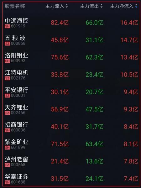 资金净流入十大人气热股: