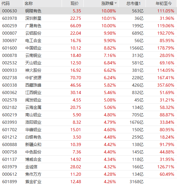 有色金属板块走强,铜陵有色、云铝股份、广晟有色等多股涨停,中国铝业大涨近9%,云南铜业、天山铝业、火神股份、江西铜业等跟涨。港股方面,中国铝业涨超10%,五矿资源涨近8%,洛阳钼业涨近6%。