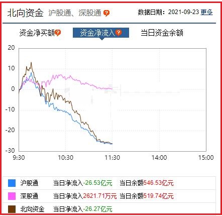 截至午间收盘: 北向资金净流出26.27亿元,其中沪股通资金净流出26.53亿元,深股通资金净流入0.26亿元。