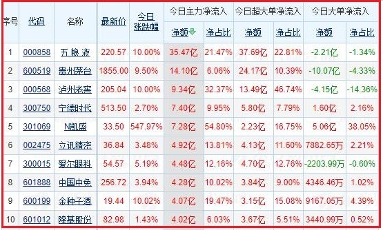 今日沪深两市主力资金净流入排名前5的个股分别为:五 粮 液、贵州茅台、泸州老窖、宁德时代、N凯盛;主力资金净流出排名前5的个股分别为:中远海控、包钢股份、三峡能源、天齐锂业、三一重工。