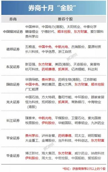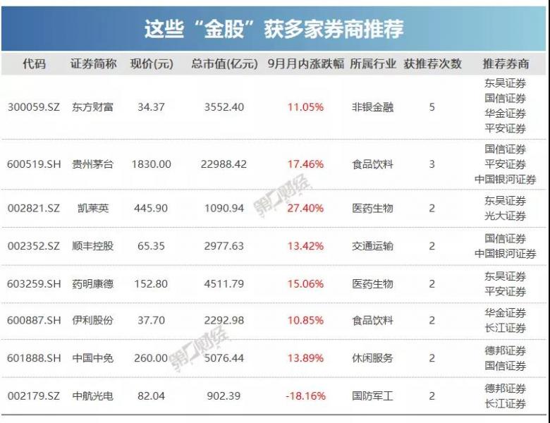 据不完全统计,在各家券商的“金股”名单中,获机构推荐次数最多的是东方财富,共获得5家券商的推荐,该股9月月内累计涨11%,最新收盘价为34.37元。