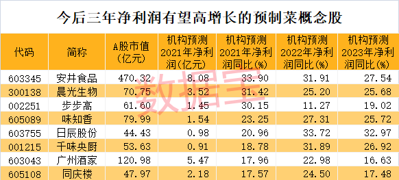 近期以食品饮料、医药、农林牧渔为主的消费板块逆市反弹,预制菜概念股也不例外。9月以来,安井食品、惠发食品、味知香、三全食品、湘佳股份等股累计涨幅10%以上。根据5家以上机构一致预测数据,今后三年净利润增速均有望超10%的有8只,分别是安井食品、晨光生物、步步高、味知香、日辰股份、千味央厨、广州酒家、同庆楼等。净利润平均增速最高的是安井食品,公司是火锅料制品龙头,机构一致预测其今后三年平均增速为31.12%。