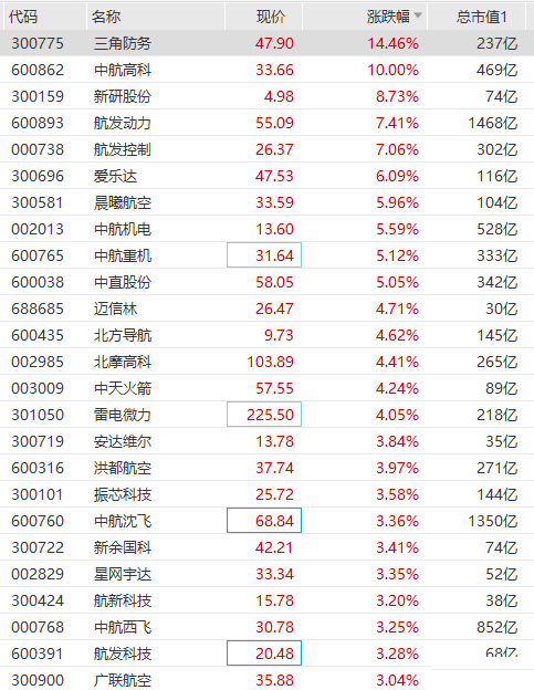 军工板块大幅拉升走强,中航高科封涨停,三角防务大涨超14%,新研股份涨超8%,航发动力、航发控制涨超7%,爱乐达、晨曦航空、中航机电、中航重机等纷纷跟涨。