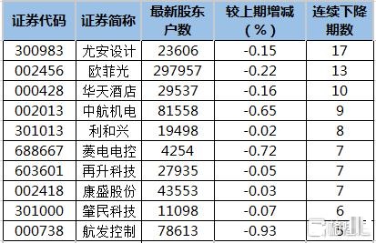 数据统计显示,367家上市公司公布了截至10月10日最新股东户数,相比之前各期,有43股股东户数连续减少3期以上,股东户数最多已连降17期。股东户数连降期数较多的有尤安设计、欧菲光、华天酒店等股。从机构动向看,股东户数连降股中,近一个月获机构调研的有3只;机构调研家数看,机构较为扎堆的是欧菲光、菱电电控,分别有17家、5家机构参与调研。