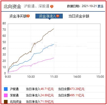 截至午间收盘: 北向资金净流入71.59亿元,其中沪股通资金净流入46.71亿元,深股通资金净流入24.89亿元。