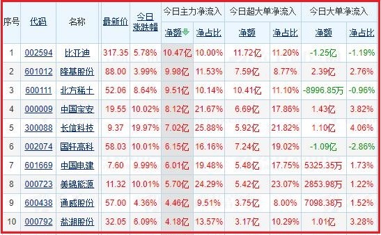 今日沪深两市主力资金净流入排名前5的个股分别为:比亚迪、隆基股份、北方稀土、中国宝安、长信科技;主力资金净流出排名前5的个股分别为:五 粮 液、格力电器、盛新锂能、京东方A、万 科A。