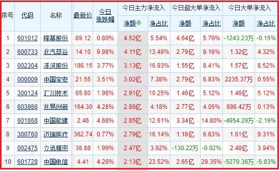今日沪深两市主力资金净流入排名前5的个股分别为:隆基股份、北汽蓝谷、洋河股份、中国宝安、汇川技术;主力资金净流出排名前5的个股分别为:天齐锂业、比亚迪、三一重工、宁德时代、东方财富。