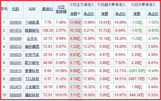 今日沪深两市主力资金净流入排名前5的个股分别为:三峡能源、隆基股份、云天化、美的集团、长安汽车;主力资金净流出排名前5的个股分别为:五 粮 液、北方稀土、天齐锂业、特变电工、包钢股份。