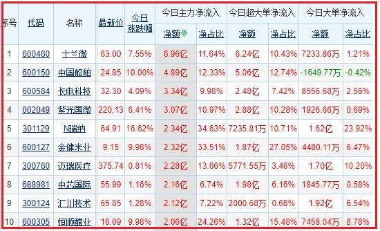 今日沪深两市主力资金净流入排名前5的个股分别为:士兰微、中国船舶、长电科技、紫光国微、N瑞纳;主力资金净流出排名前5的个股分别为:中环股份、五 粮 液、通威股份、兴业银行、平安银行。