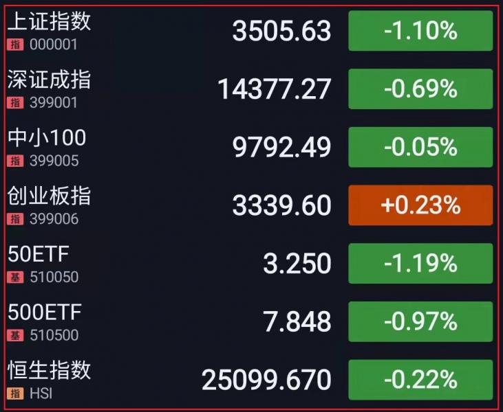 1.三大指数开盘涨跌不一,开盘后创指拉升涨逾1%,沪指早盘冲高回落翻绿,板块方面,国防军工板块受利好消息刺激走高,煤炭、钢铁、油气等周期板块集体走弱,食品饮料等大消费板块拉升走强。午后三大指数跳水,沪指盘中一度失守3500点,创指翻绿,临近尾盘,指数略有回暖,沪指站回3500点,两市成交额连续8日破万亿,北向资金累计流入近70亿元,板块方面,煤炭、油气、钢铁等周期性板块持续走低,食品饮料等消费依旧强势,黄金概念股走强。总体而言,市场情绪跌至冰点,个股普跌,赚钱效应较差。截止收盘,沪指跌1.1%,深成指跌0.69%,创业板指涨0.23%;