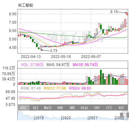 重要资讯:哈工智能(SZ 000584,收盘价:8.15元)7月3日晚间发布公告称,江苏哈工智能机器人股份有限公司股票于2022年6月29日、6月30日、7月1日连续三个交易日收盘价涨幅偏离值累计达到20%以上。公司近期披露的信息不存在需要更正、补充之处。