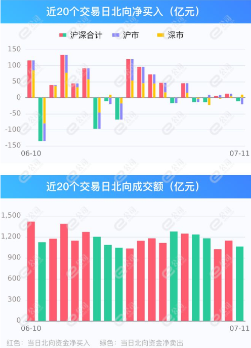 7月11日,截至A股收盘,统计数据显示北向资金合计净卖出10.69亿元,其中沪股通净买入9.7亿元,深股通净卖出20.39亿元。北向资金成交金额1062亿元,占A股总成交额10.53%,交易活跃度下降7.36%。
