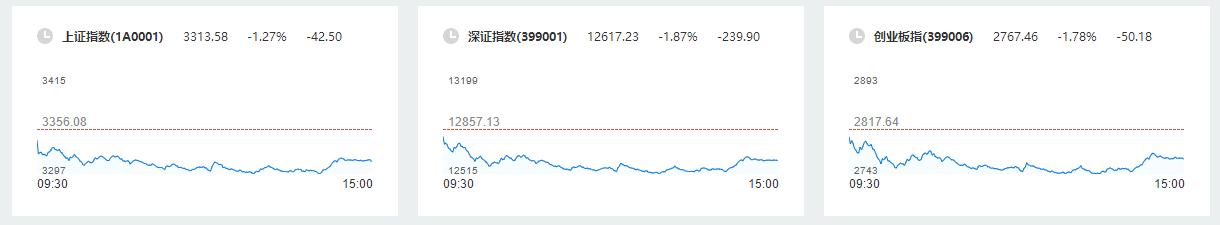 截至收盘,沪指跌1.27%报3313.58点,深成指跌1.87%报12617.23点,创业板指跌1.78%报2767.46点;两市合计成交10087亿元,北向资金净卖出10.68亿元。