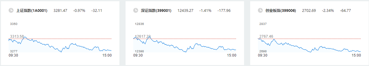 7月12日,三大股指盘中弱势震荡下探。截至收盘,沪指跌0.97%报3281.47点,深成指跌1.41%报12439.27点,创业板指跌2.34%报2702.69点;两市合计成交9768亿元。
