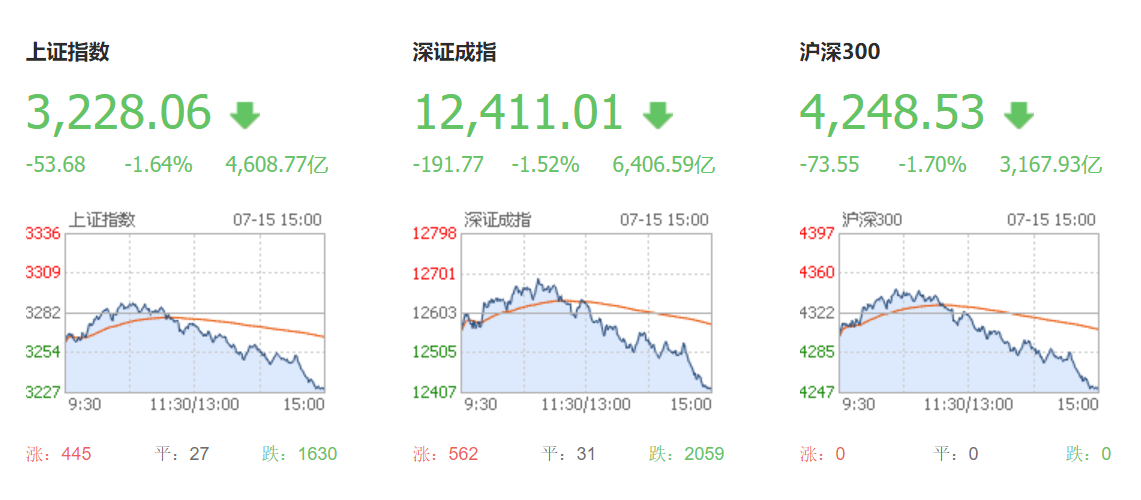 截至收盘,沪指跌1.64%报3228.06点,成交4609亿元;深成指跌1.52%报12411.01点,成交6208亿元。创业板指下跌2.08%,报2760.50点。