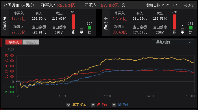 7月18日,北向资金今日净买入35.52亿元,其中沪股通净买入17.87亿元,深股通净买入17.64亿元。北向资金净流出89.31 亿元,南向资金小幅净流入。北向资金流入行业方面,电力设备、汽车、煤炭、电子、农林牧渔等板块净流入额居前,医药生物、有色金属、食品饮料、非银金融、银行等板块净流出额居前。