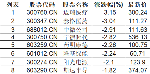截至10:30,宁组合板块下挫。迈瑞医疗(300760.CN)跌3.15%报300.24元,泰格医药(300347.CN)跌3.04%报111.27元,中微公司(688012.CN)跌2.91%报111.63元,宁德时代(300750.CN)跌2.82%报536.13元,药明康德(603259.CN)跌2.26%报100.75元,隆基绿能(601012.CN)跌2.24%报60.71元,阳光电源(300274.CN)跌2.10%报123.9元,斯达半导(603290.CN)跌1.82%报374.07元。