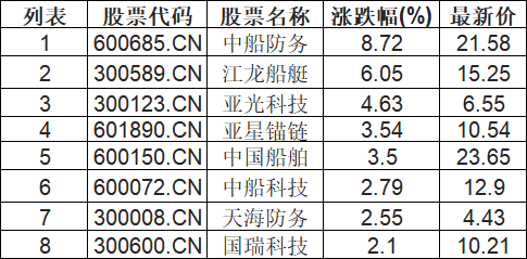 船舶制造板块拉升,中船防务(600685.CN)涨8.72%
