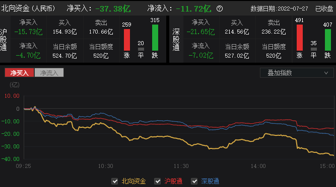 7月27日,北向资金尾盘加速离场,全天净卖出37.38亿元,上个交易日大幅净买入逾72亿元;其中沪股通净卖出15.73亿元,深股通净卖出21.65亿元。