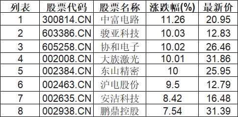 PCB板块拉升,中富电路(300814.CN)涨11.26%