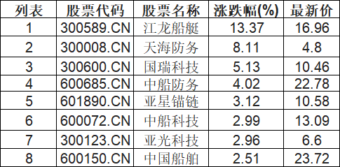 船舶制造板块高开,江龙船艇(300589.CN)涨13.37%