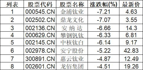 钛板块下挫,金浦钛业(000545.CN)跌7.21%