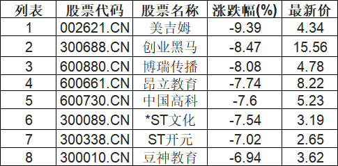 教育板块下挫,美吉姆(002621.CN)跌9.39%
