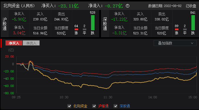 截至目前,北向资金净流出23.11亿元,其中沪股通净流出5.9亿元,深股通净流出17.22亿元。
