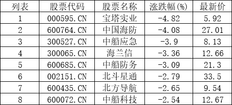 截至09:45,航母概念板块下挫。宝塔实业(000595.CN)跌4.82%报5.92元,中国海防(600764.CN)跌4.08%报27.01元,中船应急(300527.CN)跌3.90%报8.13元,海兰信(300065.CN)跌3.36%报12.66元,中船防务(600685.CN)跌3.09%报21.3元,北斗星通(002151.CN)跌2.79%报33.5元,北方导航(600435.CN)跌2.65%报9.54元,中船科技(600072.CN)跌2.54%报12.67元。