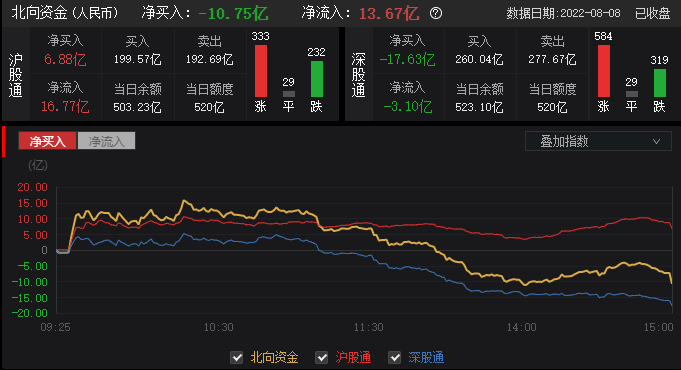北向资金全天小幅净卖出10.75亿元,其中沪股通净买入6.88亿元,深股通净卖出17.63亿元。其中沪股通净买入6.88亿元,深股通净卖出17.63亿元。北向资金成交金额929.98亿元,占A股总成交额9.83%,交易活跃度下降6.80%,其中沪股通买入金额199.57亿元,卖出金额192.69亿元,深股通买入金额260.04亿元,卖出金额277.67亿元。
