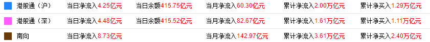 截至8月8日港股收盘,南向资金今日合计净流入8.73亿港元,其中,沪市港股通净流入4.25港元,深市港股通净流入4.48亿港元。