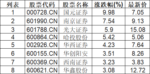 截至11:15,证券板块拉升。国元证券(000728.CN)涨9.98%报7.05元,南京证券(601990.CN)涨7.54%报9.13元,光大证券(601788.CN)涨5.90%报15.08元,哈投股份(600864.CN)涨5.42%报5.06元,华西证券(002926.CN)涨4.23%报7.64元,华创阳安(600155.CN)涨3.51%报8.26元,西南证券(600369.CN)涨3.23%报3.83元,华鑫股份(600621.CN)涨3.08%报12.72元。