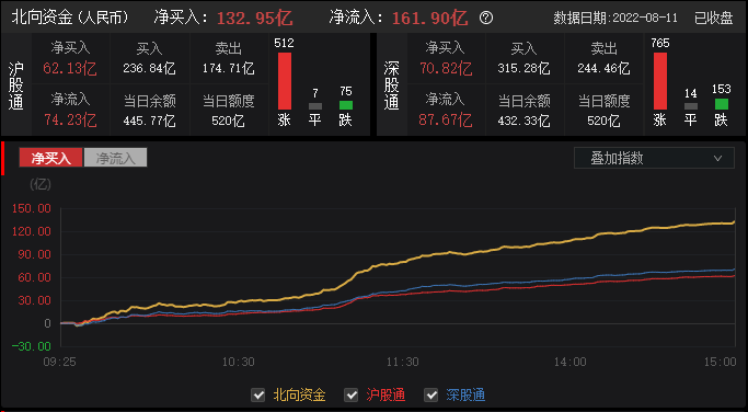 北向资金全天单边净买入132.95亿元,创近3个月新高,终结连续3日净卖出;其中沪股通净买入62.13亿元,深股通净买入70.82亿元。
