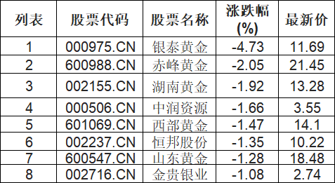 贵金属板块下挫,银泰黄金(000975.CN)跌4.73%