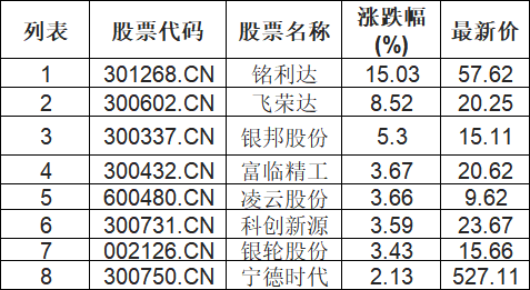 麒麟电池板块拉升,铭利达(301268.CN)涨5.03%