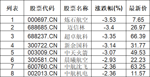 截至11:15,航天航空板块下挫。炼石航空(000697.CN)跌3.53%报7.65元,迈信林(688685.CN)跌3.40%报26.97元,超卓航科(688237.CN)跌3.35%报66.39元,新余国科(300722.CN)跌3.14%报31.77元,中天火箭(003009.CN)跌3.07%报49.53元,晨曦航空(300581.CN)跌2.93%报22.23元,中航沈飞(600760.CN)跌2.36%报63.25元,中航机电(002013.CN)跌2.36%报11.57元。
