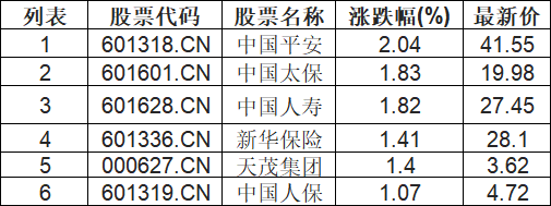 截至09:30,保险板块高开。中国平安(601318.CN)涨2.04%报41.55元,中国太保(601601.CN)涨1.83%报19.98元,中国人寿(601628.CN)涨1.82%报27.45元,新华保险(601336.CN)涨1.41%报28.1元,天茂集团(000627.CN)涨1.40%报3.62元,中国人保(601319.CN)涨1.07%报4.72元。
