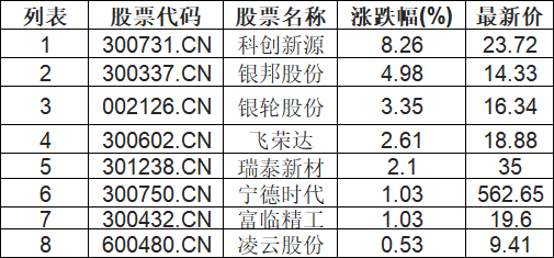 麒麟电池板块高开,科创新源(300731.CN)涨8.26%