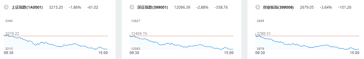 8月24日,两市股指全线走低,盘中大幅单边下行,沪指跌近2%,深成指跌近3%,创业板指盘中大跌近4%;两市成交额连续7日突破万亿,北向资金净卖出约66亿元。截至收盘,沪指跌1.86%报3215.2点,深成指跌2.88%报12096.39点,创业板指跌3.64%报2679.05点,科创50指数跌3.46%。