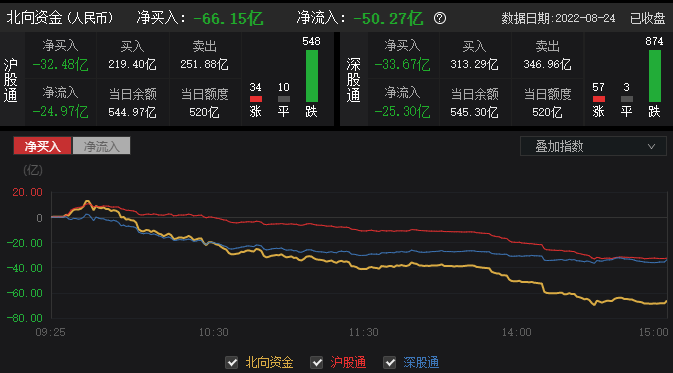 数据显示,8月24日,北向资金全天净卖出66.15亿元。其中,沪股通净卖出32.48亿元,深股通净卖出33.67亿元。