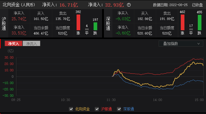 8月25日,截至A股收盘,统计数据显示北向资金合计净买入16.71亿元,其中沪股通净买入25.74亿元,深股通净卖出9.03亿元。北向资金成交金额672.01亿元,占A股总成交额6.84%,交易活跃度下降40.61%。