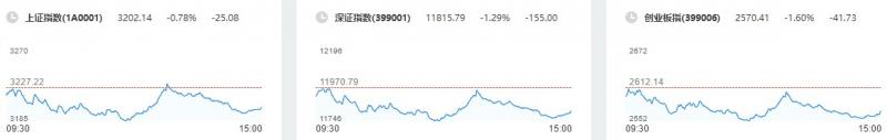 截至收盘,沪指跌0.78%报3202.14点,深成指跌1.29%报11815.79点,创业板指跌1.6%报2570.41点,科创50指数跌1.96%,上证50指数涨1.29%;两市合计成交10024亿元,北向资金净买入79亿元。