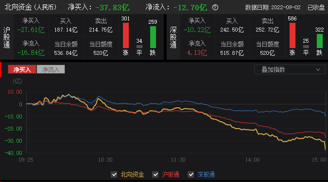 9月2日下午,以买卖成交额口径(挂单已成交)统计,截至目前北向资金净卖出超12亿元,其中沪股通净卖出9亿元,深股通净卖出2亿元。以余额规模口径(已挂单)统计,北向资金净流出超3亿元,其中沪股通净流出超6亿元,深股通净流入超2亿元。