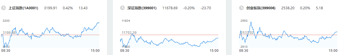 截止收盘,上证指数报收3199.91点,上涨13.43点,涨幅0.42%。成交额3396亿。深证成指报收11678.69点,下跌23.70点,跌幅0.2%,成交额4301亿。创业板指报收2538.20点,上涨5.18点,涨幅5.18%,成交额1396亿。沪深两市,个股共计上涨2645只,下跌2232只,涨停64只,跌停11只。