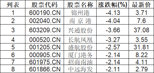 航运港口板块下挫,锦州港(600190.CN)跌4.13%